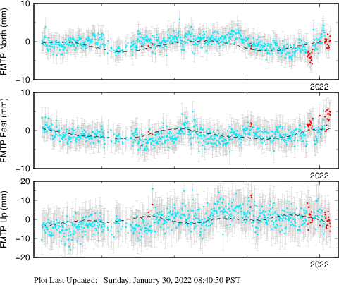 | Decimal date | N log amplitude (mm) | N log amplitude standard deviation (mm) | N time constant (years) | E log amplitude (mm) | E log amplitude standard deviation (mm) | E time constant (years) | U log amplitude (mm) | U log amplitude standard deviation (mm) | U time constant (years) | |