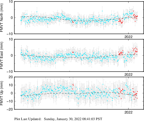 | Decimal date | N log amplitude (mm) | N log amplitude standard deviation (mm) | N time constant (years) | E log amplitude (mm) | E log amplitude standard deviation (mm) | E time constant (years) | U log amplitude (mm) | U log amplitude standard deviation (mm) | U time constant (years) | |