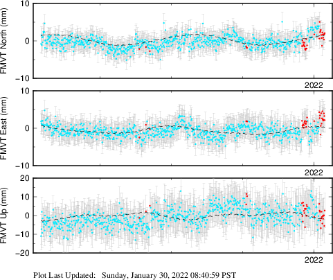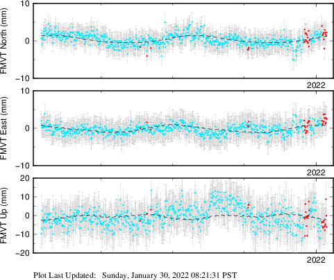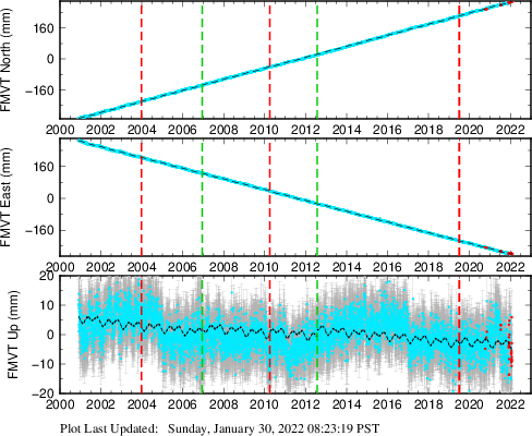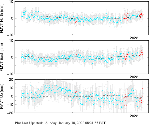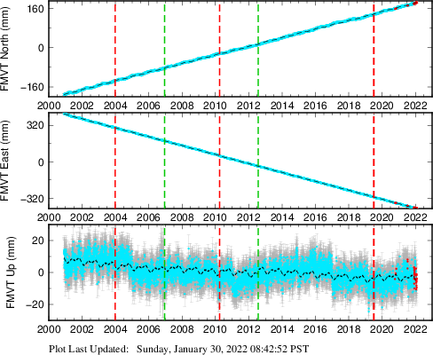 These results are preliminary. The station positions are unchecked and should not be used for any engineering applications. There may be errors in the antenna heights. The velocities are very dependent on the length of the span of observations. The presence of outliers (errant observations) sometimes contaminates the velocities.