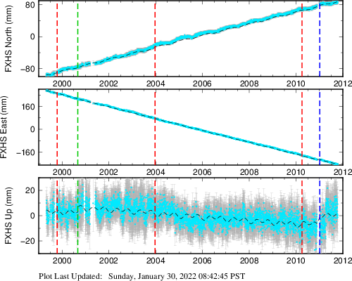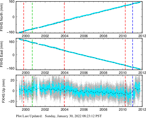 These results are preliminary. The station positions are unchecked and should not be used for any engineering applications. There may be errors in the antenna heights. The velocities are very dependent on the length of the span of observations. The presence of outliers (errant observations) sometimes contaminates the velocities.
