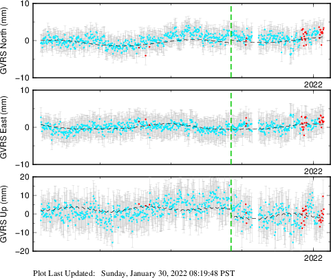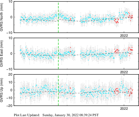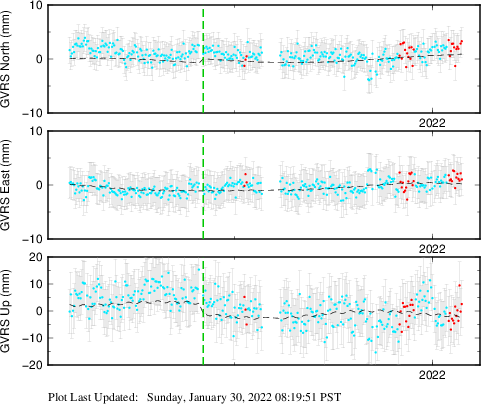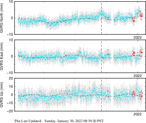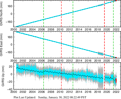 These results are preliminary. The station positions are unchecked and should not be used for any engineering applications. There may be errors in the antenna heights. The velocities are very dependent on the length of the span of observations. The presence of outliers (errant observations) sometimes contaminates the velocities.
