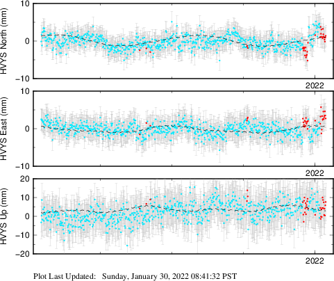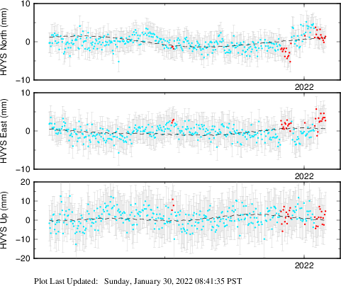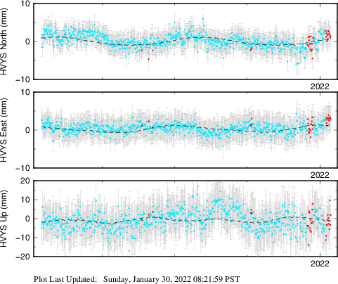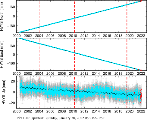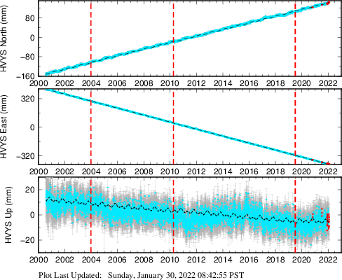 These results are preliminary. The station positions are unchecked and should not be used for any engineering applications. There may be errors in the antenna heights. The velocities are very dependent on the length of the span of observations. The presence of outliers (errant observations) sometimes contaminates the velocities.