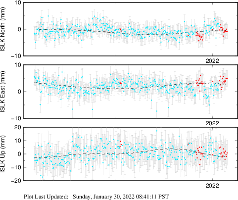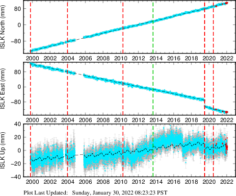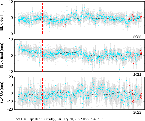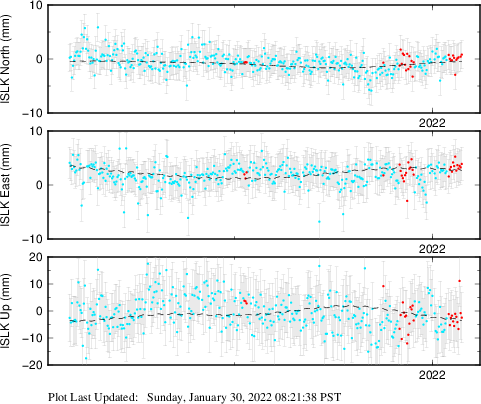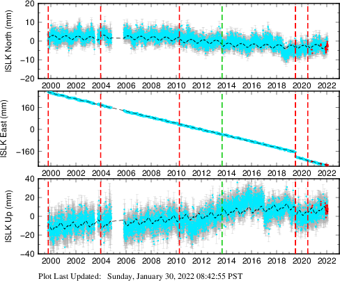 These results are preliminary. The station positions are unchecked and should not be used for any engineering applications. There may be errors in the antenna heights. The velocities are very dependent on the length of the span of observations. The presence of outliers (errant observations) sometimes contaminates the velocities.
