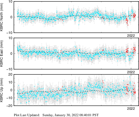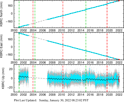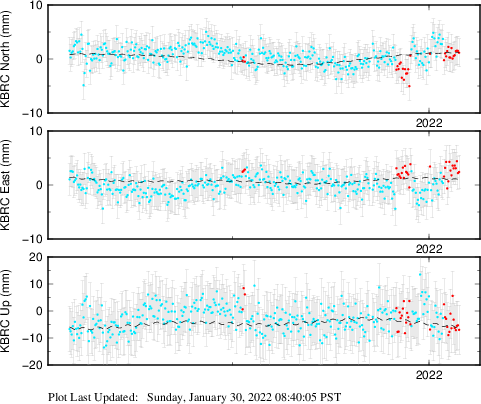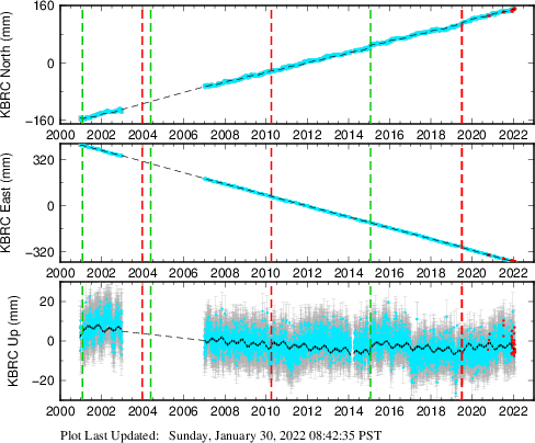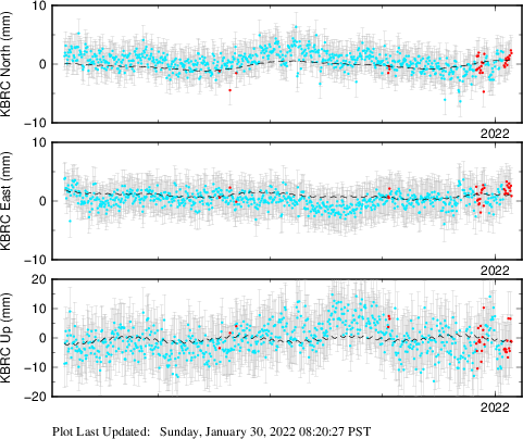 These results are preliminary. The station positions are unchecked and should not be used for any engineering applications. There may be errors in the antenna heights. The velocities are very dependent on the length of the span of observations. The presence of outliers (errant observations) sometimes contaminates the velocities.