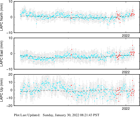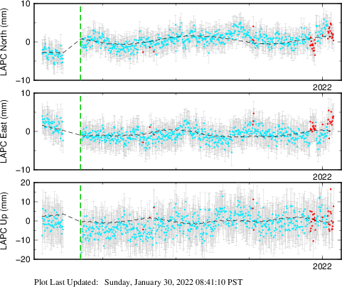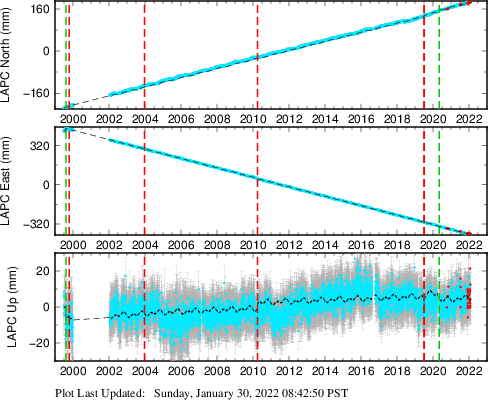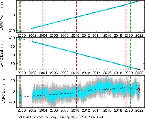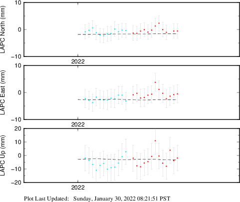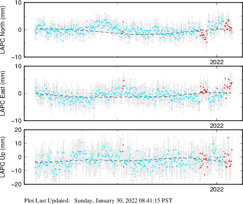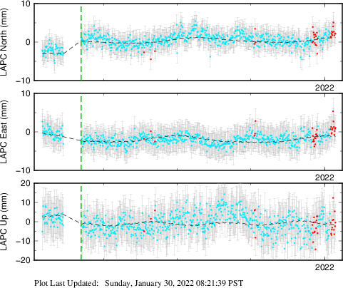 These results are preliminary. The station positions are unchecked and should not be used for any engineering applications. There may be errors in the antenna heights. The velocities are very dependent on the length of the span of observations. The presence of outliers (errant observations) sometimes contaminates the velocities.