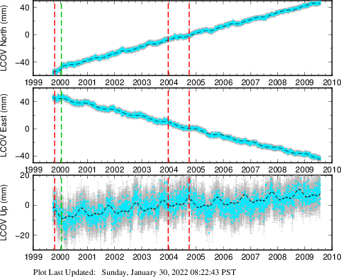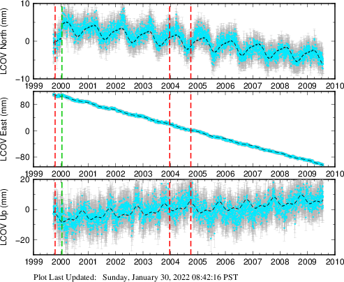 These results are preliminary. The station positions are unchecked and should not be used for any engineering applications. There may be errors in the antenna heights. The velocities are very dependent on the length of the span of observations. The presence of outliers (errant observations) sometimes contaminates the velocities.