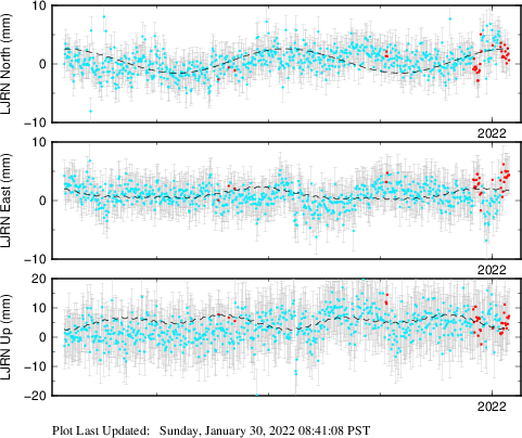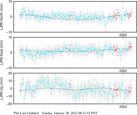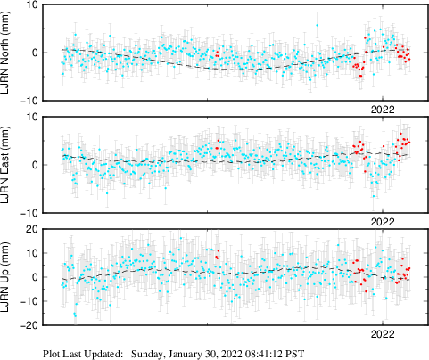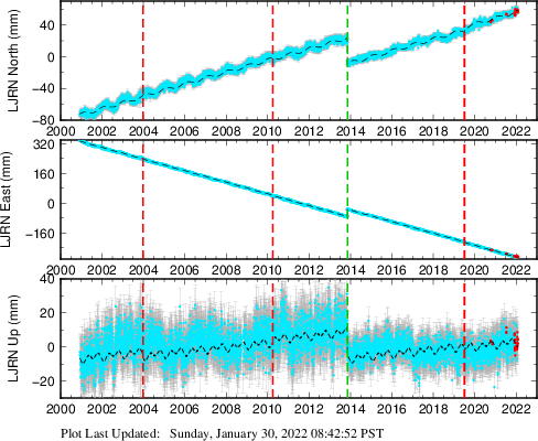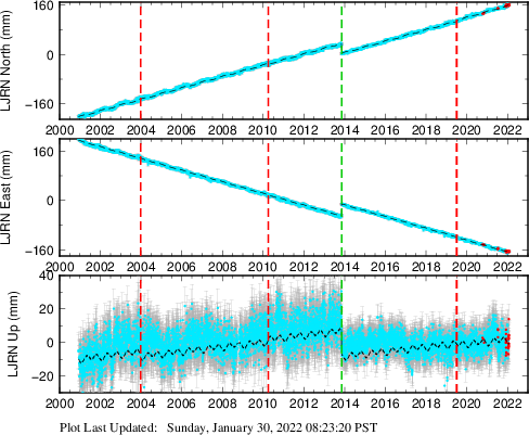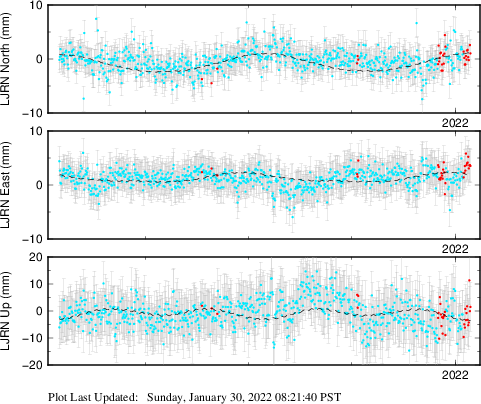 These results are preliminary. The station positions are unchecked and should not be used for any engineering applications. There may be errors in the antenna heights. The velocities are very dependent on the length of the span of observations. The presence of outliers (errant observations) sometimes contaminates the velocities.