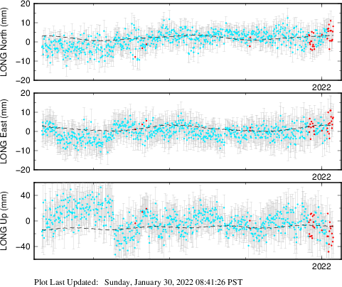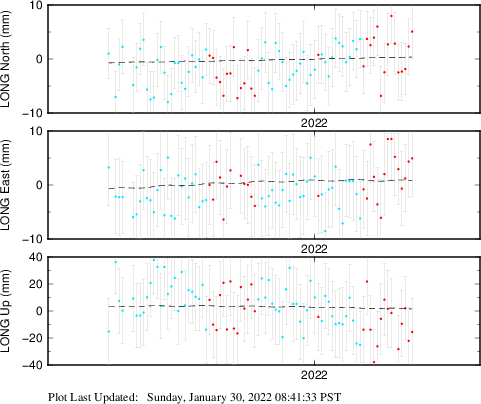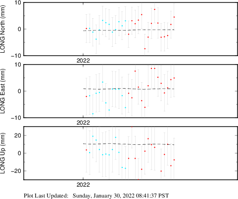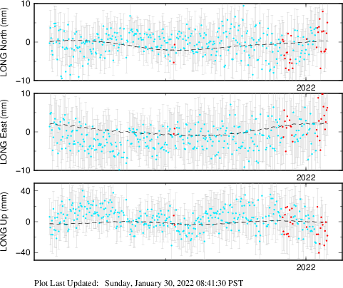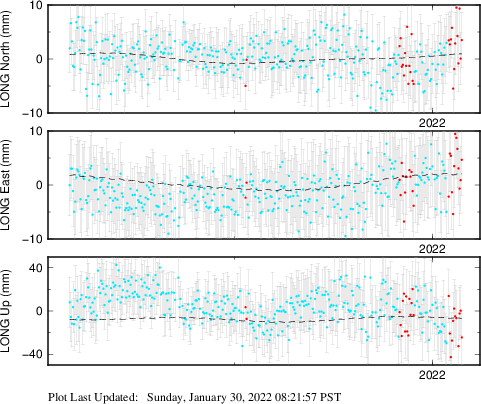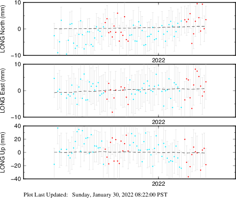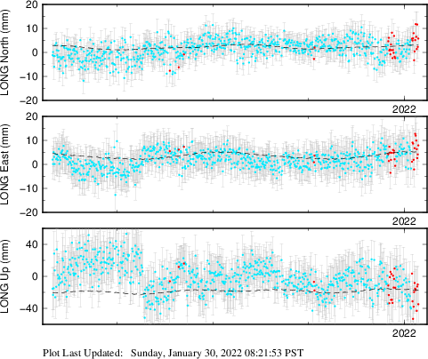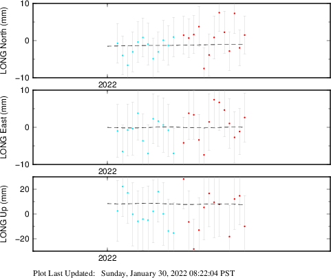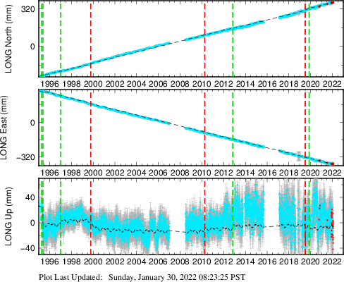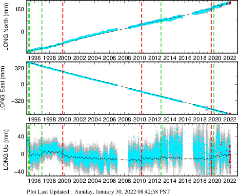 These results are preliminary. The station positions are unchecked and should not be used for any engineering applications. There may be errors in the antenna heights. The velocities are very dependent on the length of the span of observations. The presence of outliers (errant observations) sometimes contaminates the velocities.