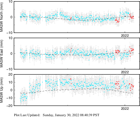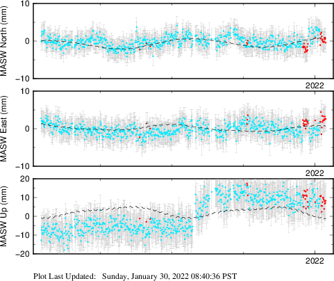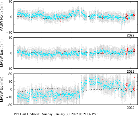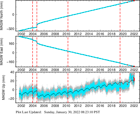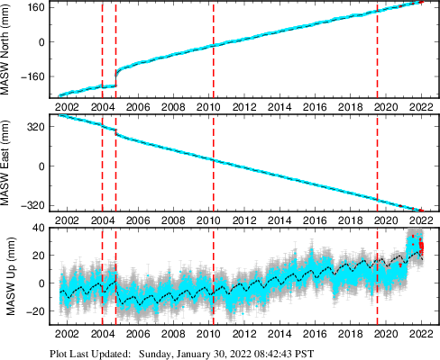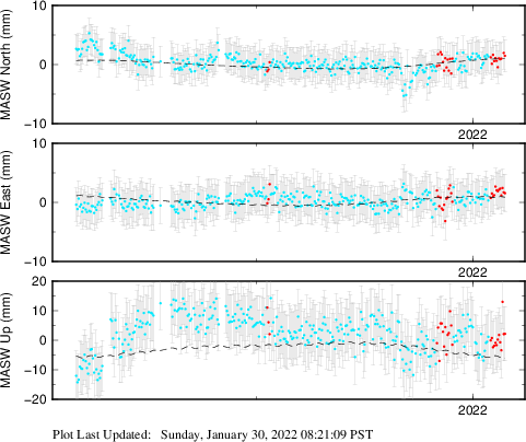 These results are preliminary. The station positions are unchecked and should not be used for any engineering applications. There may be errors in the antenna heights. The velocities are very dependent on the length of the span of observations. The presence of outliers (errant observations) sometimes contaminates the velocities.