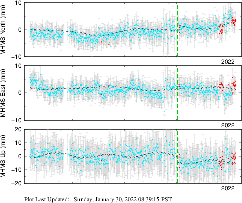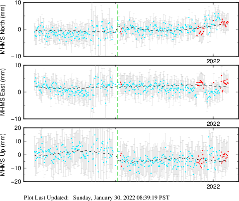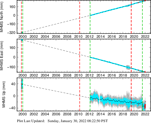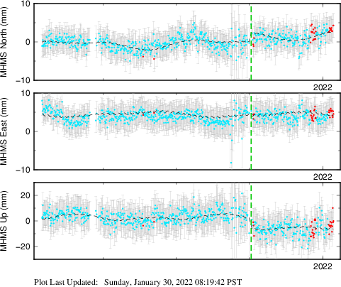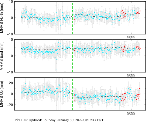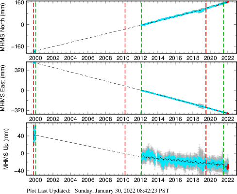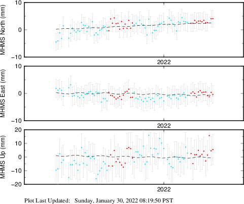 These results are preliminary. The station positions are unchecked and should not be used for any engineering applications. There may be errors in the antenna heights. The velocities are very dependent on the length of the span of observations. The presence of outliers (errant observations) sometimes contaminates the velocities.