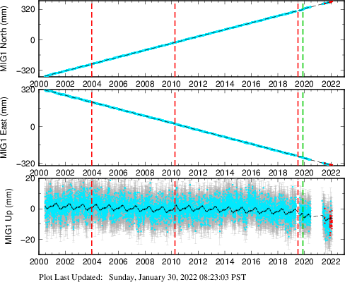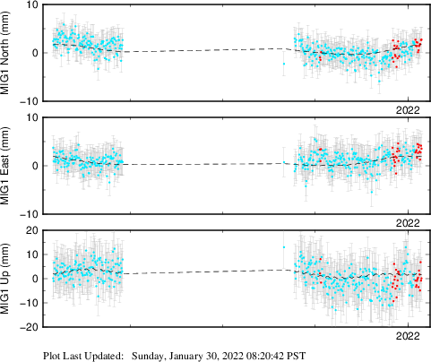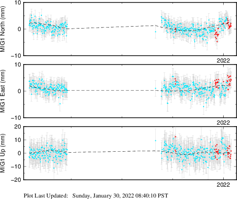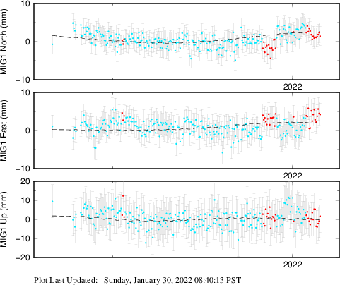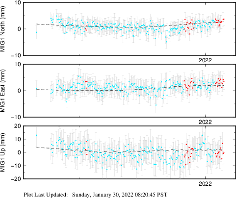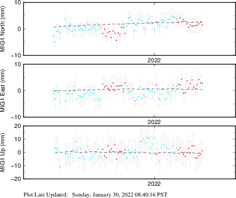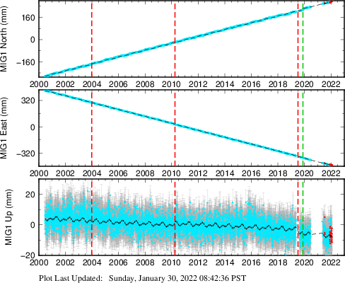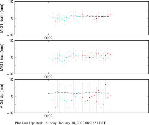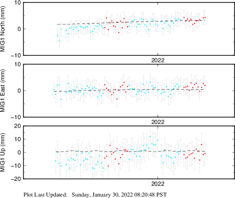 These results are preliminary. The station positions are unchecked and should not be used for any engineering applications. There may be errors in the antenna heights. The velocities are very dependent on the length of the span of observations. The presence of outliers (errant observations) sometimes contaminates the velocities.