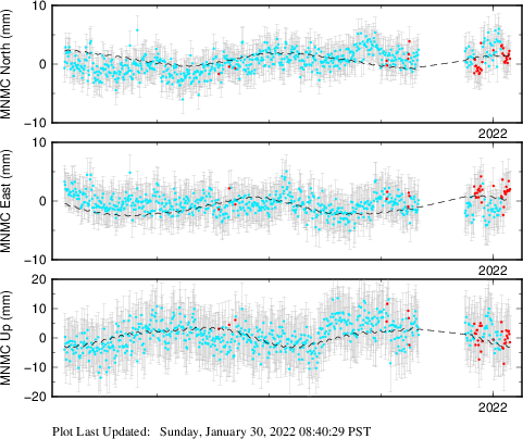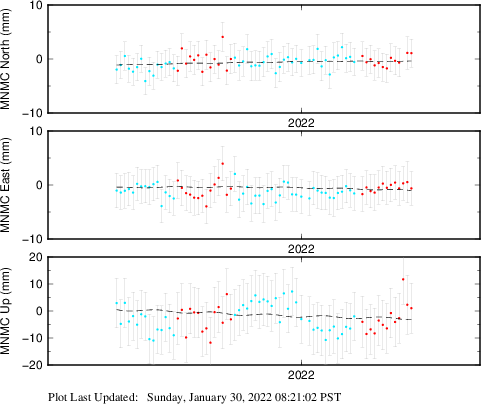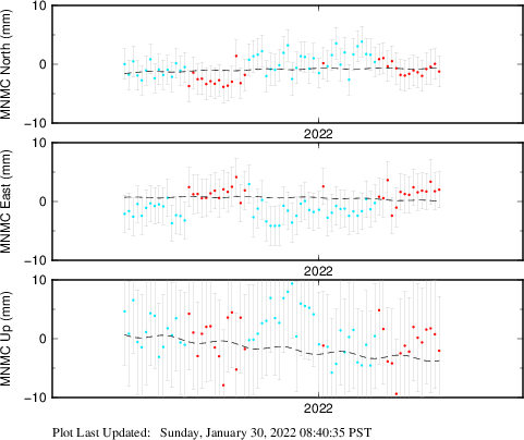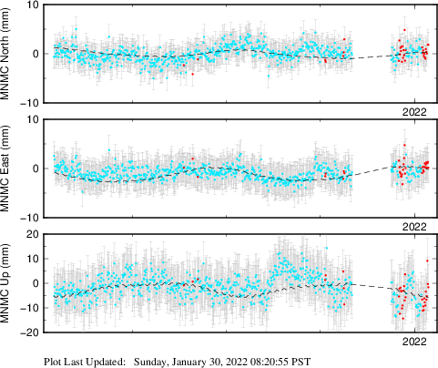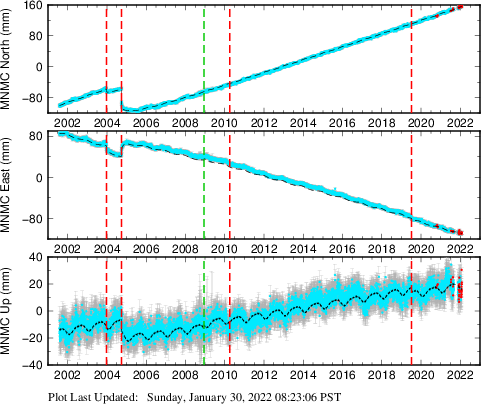These results are preliminary. The station positions are unchecked and should not be used for any engineering applications. There may be errors in the antenna heights. The velocities are very dependent on the length of the span of observations. The presence of outliers (errant observations) sometimes contaminates the velocities.