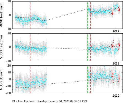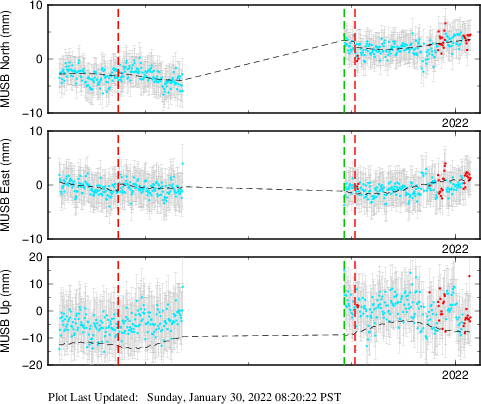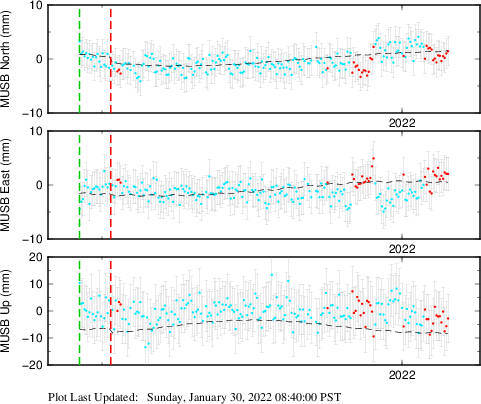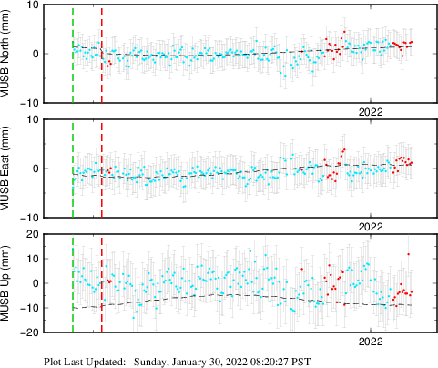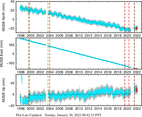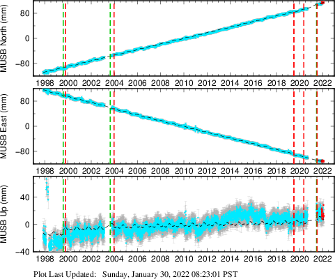 These results are preliminary. The station positions are unchecked and should not be used for any engineering applications. There may be errors in the antenna heights. The velocities are very dependent on the length of the span of observations. The presence of outliers (errant observations) sometimes contaminates the velocities.