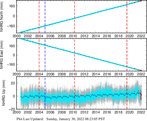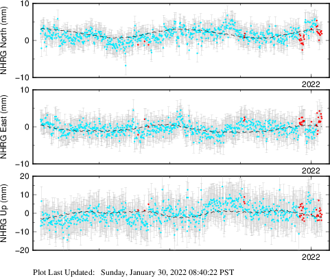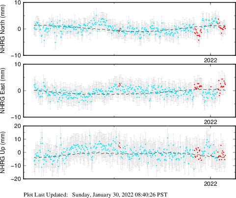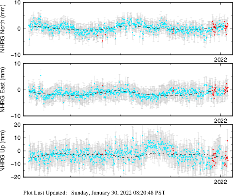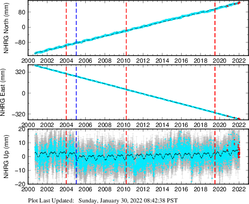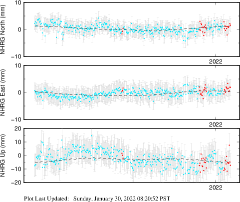 These results are preliminary. The station positions are unchecked and should not be used for any engineering applications. There may be errors in the antenna heights. The velocities are very dependent on the length of the span of observations. The presence of outliers (errant observations) sometimes contaminates the velocities.