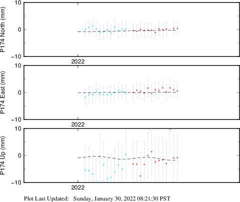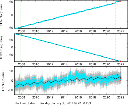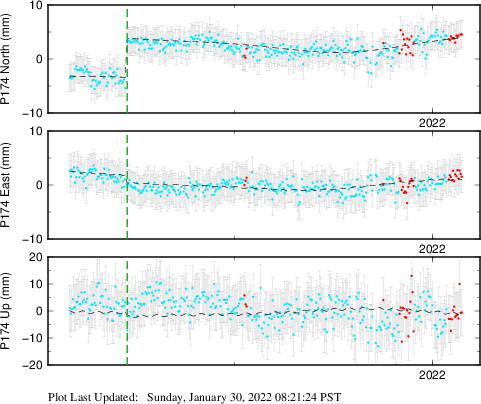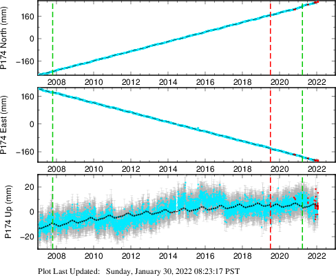 These results are preliminary. The station positions are unchecked and should not be used for any engineering applications. There may be errors in the antenna heights. The velocities are very dependent on the length of the span of observations. The presence of outliers (errant observations) sometimes contaminates the velocities.