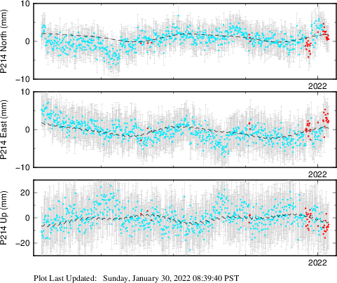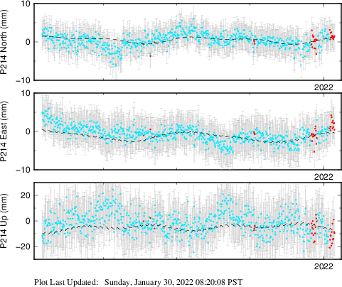 | Decimal date | N log amplitude (mm) | N log amplitude standard deviation (mm) | N time constant (years) | E log amplitude (mm) | E log amplitude standard deviation (mm) | E time constant (years) | U log amplitude (mm) | U log amplitude standard deviation (mm) | U time constant (years) | |