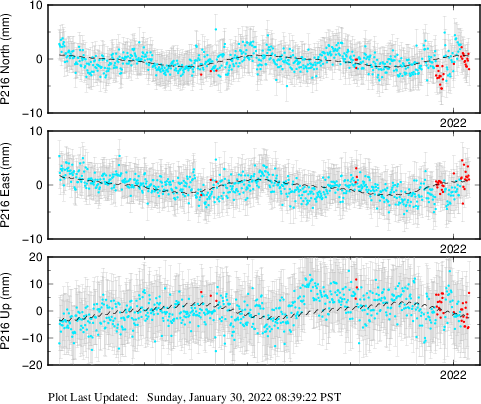 | Decimal date | N log amplitude (mm) | N log amplitude standard deviation (mm) | N time constant (years) | E log amplitude (mm) | E log amplitude standard deviation (mm) | E time constant (years) | U log amplitude (mm) | U log amplitude standard deviation (mm) | U time constant (years) | |