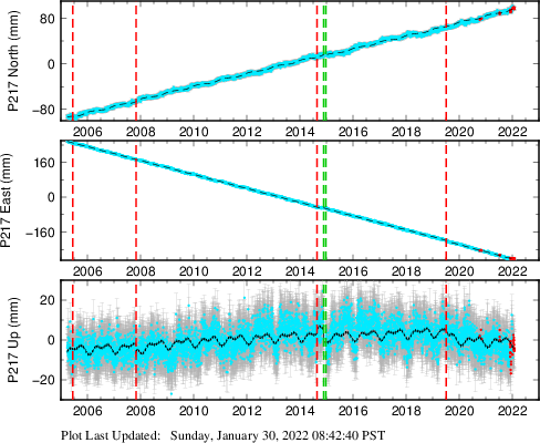 These results are preliminary. The station positions are unchecked and should not be used for any engineering applications. There may be errors in the antenna heights. The velocities are very dependent on the length of the span of observations. The presence of outliers (errant observations) sometimes contaminates the velocities.