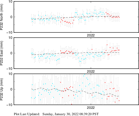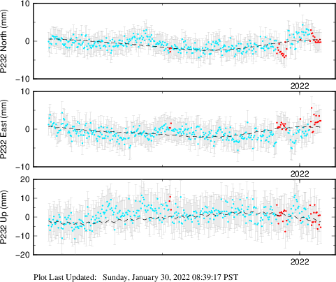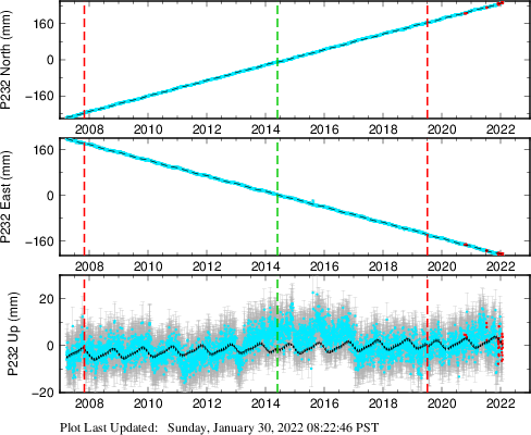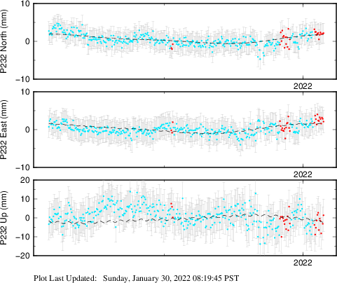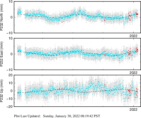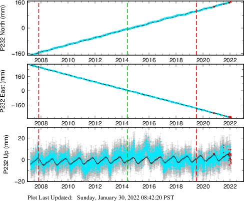 These results are preliminary. The station positions are unchecked and should not be used for any engineering applications. There may be errors in the antenna heights. The velocities are very dependent on the length of the span of observations. The presence of outliers (errant observations) sometimes contaminates the velocities.