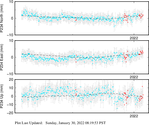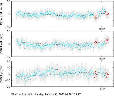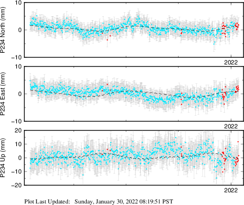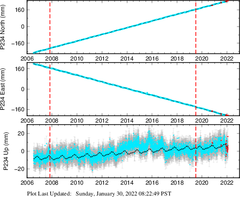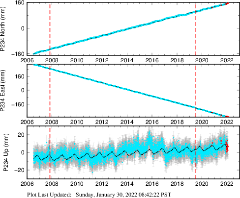 These results are preliminary. The station positions are unchecked and should not be used for any engineering applications. There may be errors in the antenna heights. The velocities are very dependent on the length of the span of observations. The presence of outliers (errant observations) sometimes contaminates the velocities.