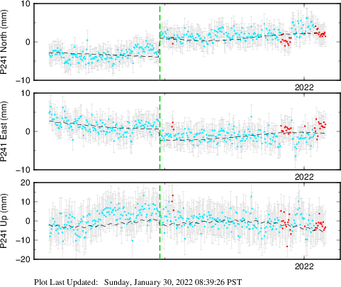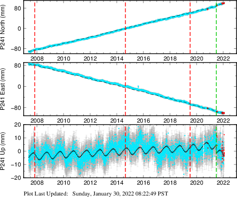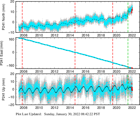 These results are preliminary. The station positions are unchecked and should not be used for any engineering applications. There may be errors in the antenna heights. The velocities are very dependent on the length of the span of observations. The presence of outliers (errant observations) sometimes contaminates the velocities.