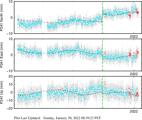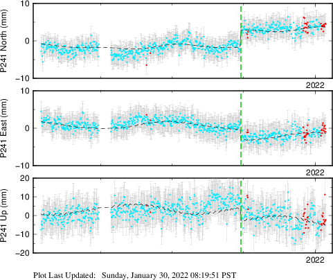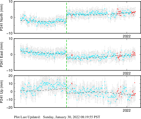 | Decimal date | N offset (mm) | N uncertainty (mm) | E offset (mm) | E uncertainty (mm) | U offset (mm) | U uncertainty (mm) | Type | Earthquake magnitude | Earthquake information | Distance from epicenter (km) | |