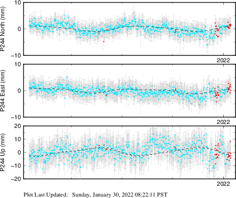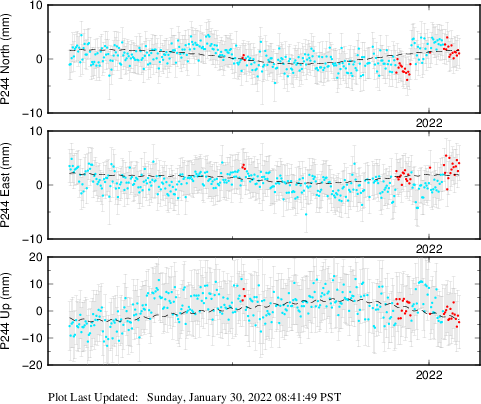 | Decimal date | N log amplitude (mm) | N log amplitude standard deviation (mm) | N time constant (years) | E log amplitude (mm) | E log amplitude standard deviation (mm) | E time constant (years) | U log amplitude (mm) | U log amplitude standard deviation (mm) | U time constant (years) | |