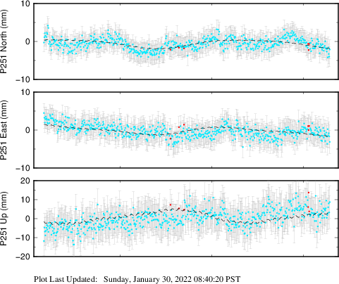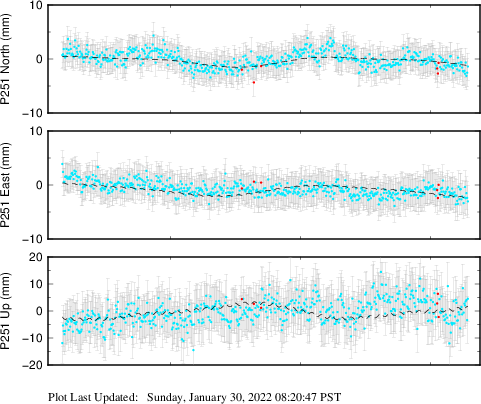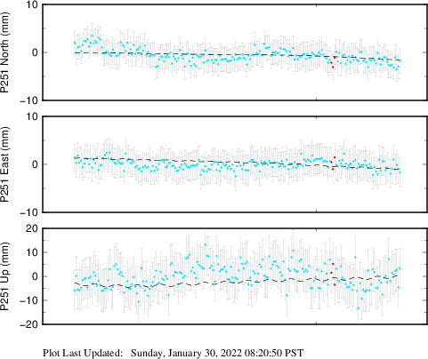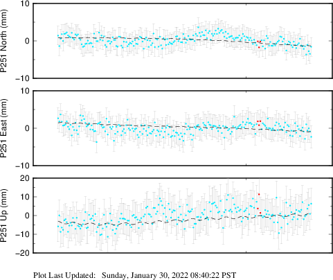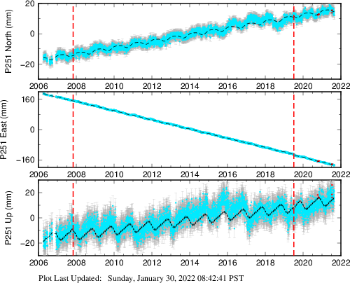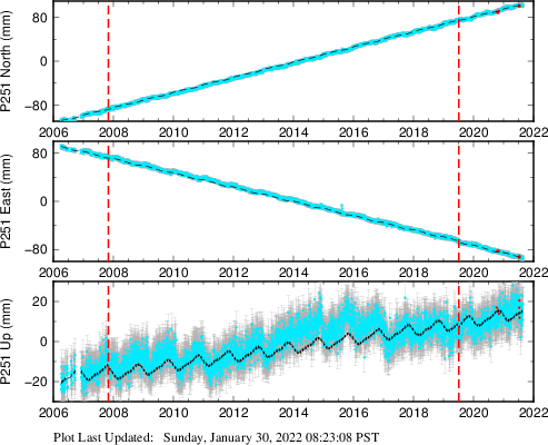 These results are preliminary. The station positions are unchecked and should not be used for any engineering applications. There may be errors in the antenna heights. The velocities are very dependent on the length of the span of observations. The presence of outliers (errant observations) sometimes contaminates the velocities.