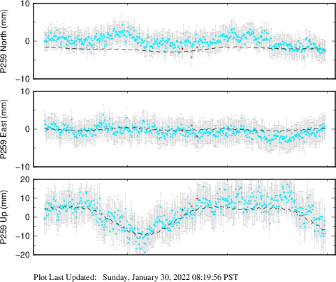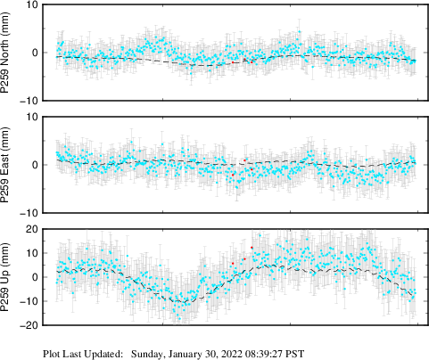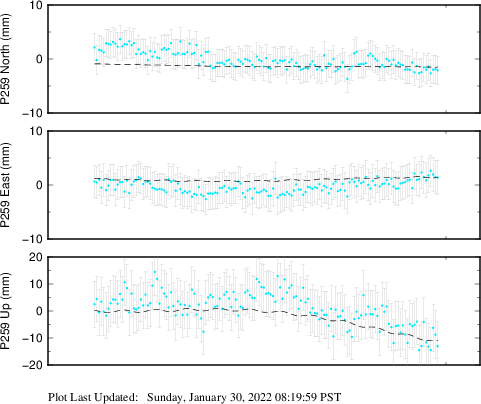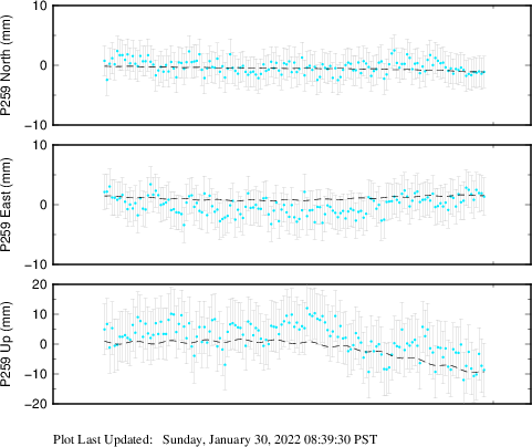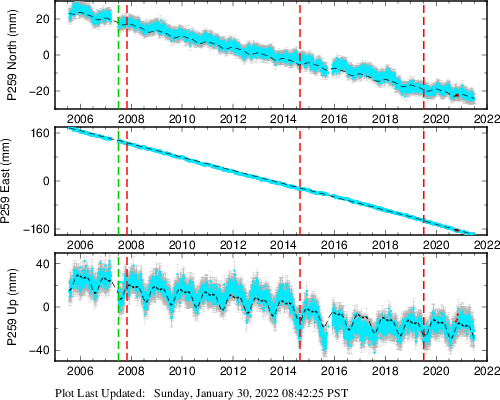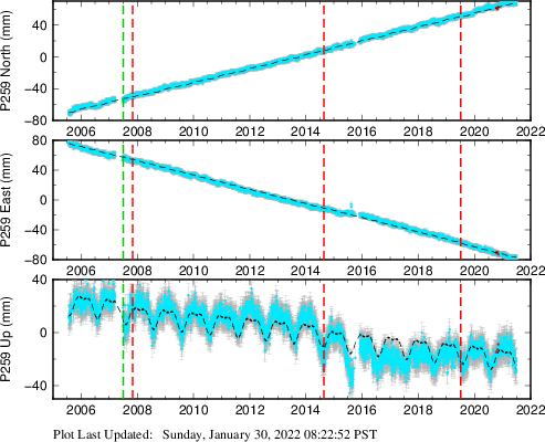 These results are preliminary. The station positions are unchecked and should not be used for any engineering applications. There may be errors in the antenna heights. The velocities are very dependent on the length of the span of observations. The presence of outliers (errant observations) sometimes contaminates the velocities.