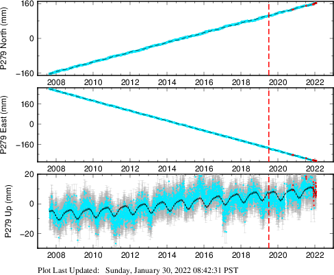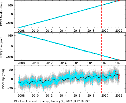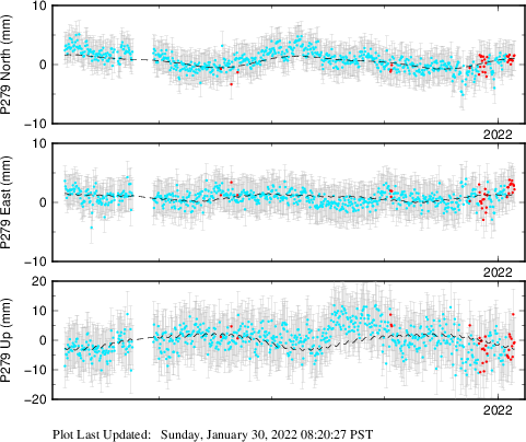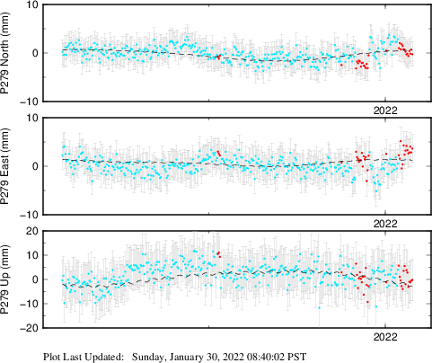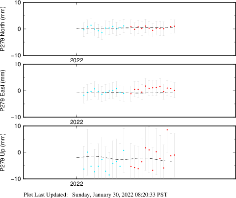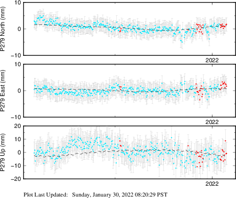 These results are preliminary. The station positions are unchecked and should not be used for any engineering applications. There may be errors in the antenna heights. The velocities are very dependent on the length of the span of observations. The presence of outliers (errant observations) sometimes contaminates the velocities.