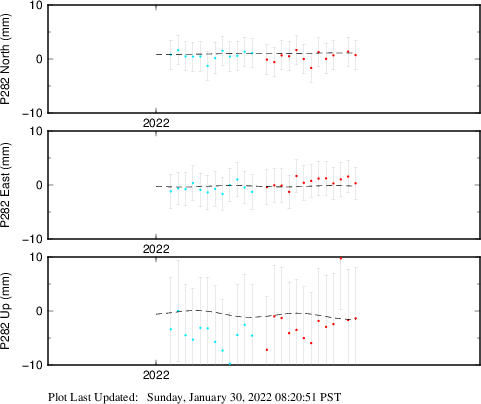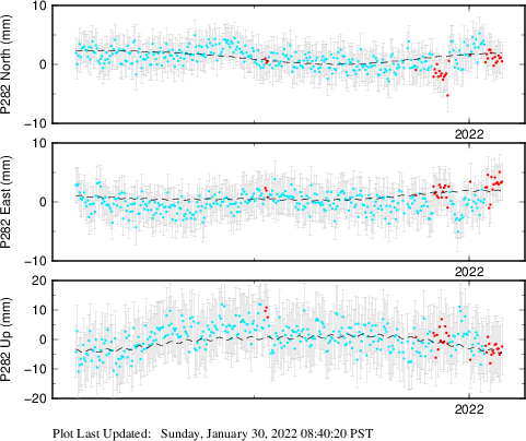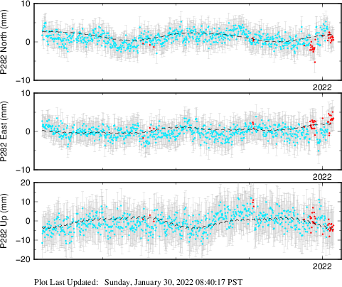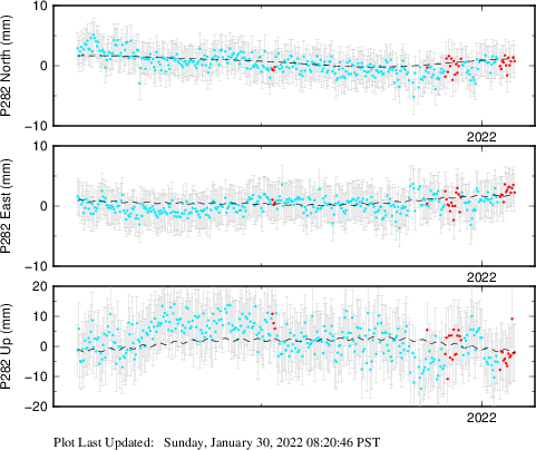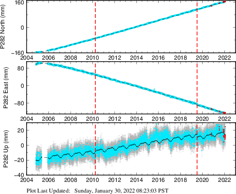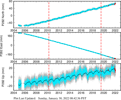 These results are preliminary. The station positions are unchecked and should not be used for any engineering applications. There may be errors in the antenna heights. The velocities are very dependent on the length of the span of observations. The presence of outliers (errant observations) sometimes contaminates the velocities.