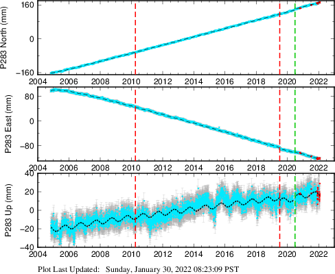 These results are preliminary. The station positions are unchecked and should not be used for any engineering applications. There may be errors in the antenna heights. The velocities are very dependent on the length of the span of observations. The presence of outliers (errant observations) sometimes contaminates the velocities.
