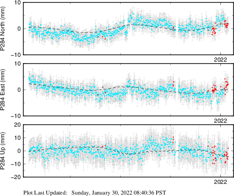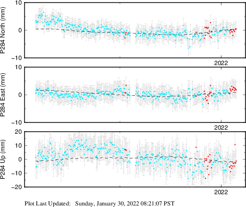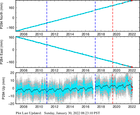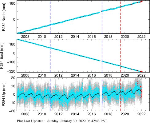 These results are preliminary. The station positions are unchecked and should not be used for any engineering applications. There may be errors in the antenna heights. The velocities are very dependent on the length of the span of observations. The presence of outliers (errant observations) sometimes contaminates the velocities.