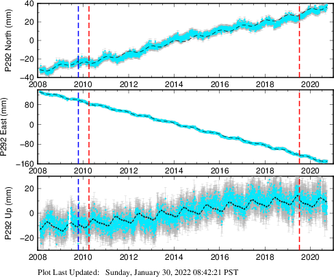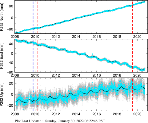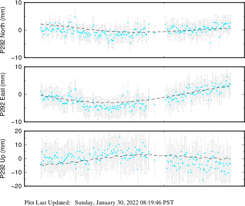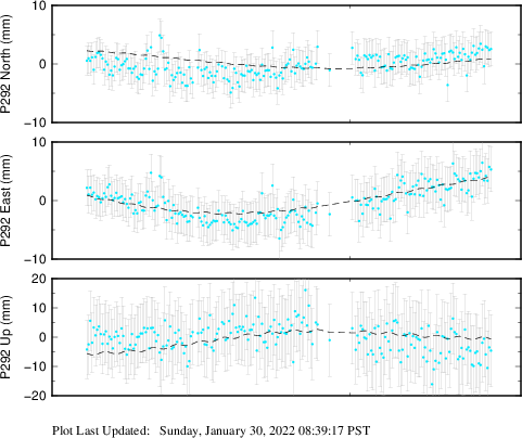 These results are preliminary. The station positions are unchecked and should not be used for any engineering applications. There may be errors in the antenna heights. The velocities are very dependent on the length of the span of observations. The presence of outliers (errant observations) sometimes contaminates the velocities.