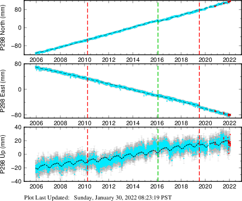 These results are preliminary. The station positions are unchecked and should not be used for any engineering applications. There may be errors in the antenna heights. The velocities are very dependent on the length of the span of observations. The presence of outliers (errant observations) sometimes contaminates the velocities.