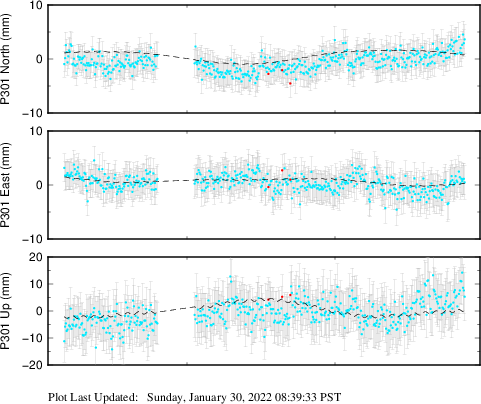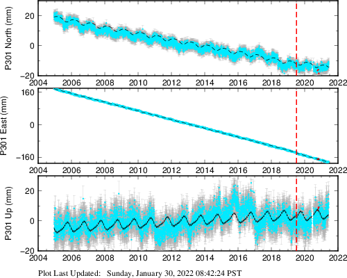 | Decimal date | N log amplitude (mm) | N log amplitude standard deviation (mm) | N time constant (years) | E log amplitude (mm) | E log amplitude standard deviation (mm) | E time constant (years) | U log amplitude (mm) | U log amplitude standard deviation (mm) | U time constant (years) | |