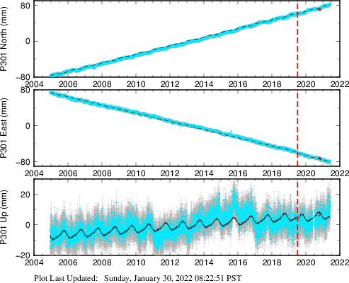 These results are preliminary. The station positions are unchecked and should not be used for any engineering applications. There may be errors in the antenna heights. The velocities are very dependent on the length of the span of observations. The presence of outliers (errant observations) sometimes contaminates the velocities.