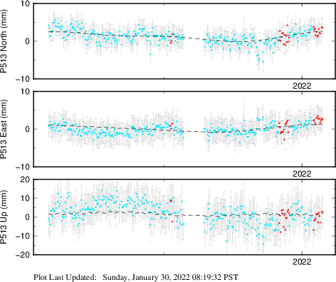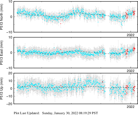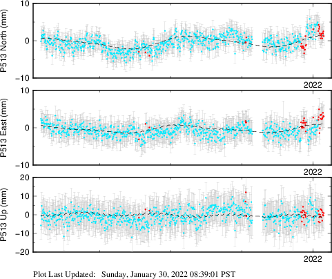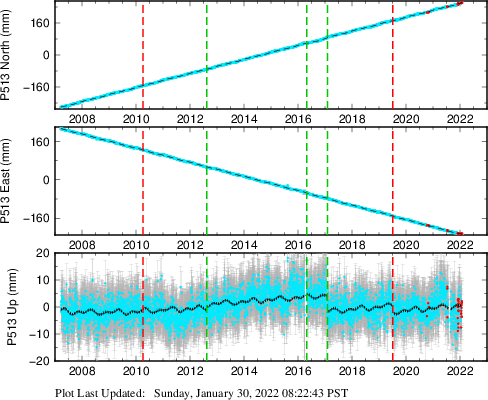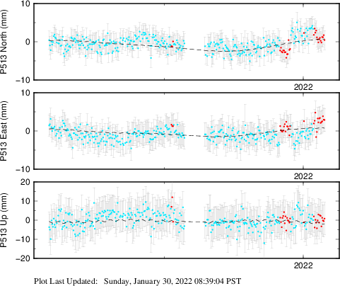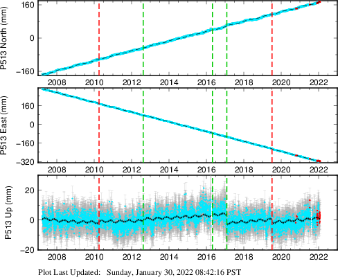 These results are preliminary. The station positions are unchecked and should not be used for any engineering applications. There may be errors in the antenna heights. The velocities are very dependent on the length of the span of observations. The presence of outliers (errant observations) sometimes contaminates the velocities.