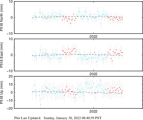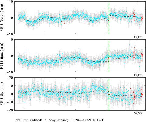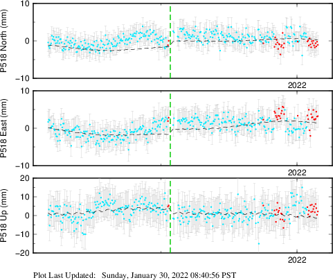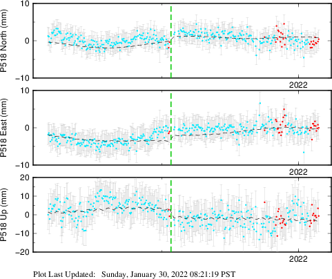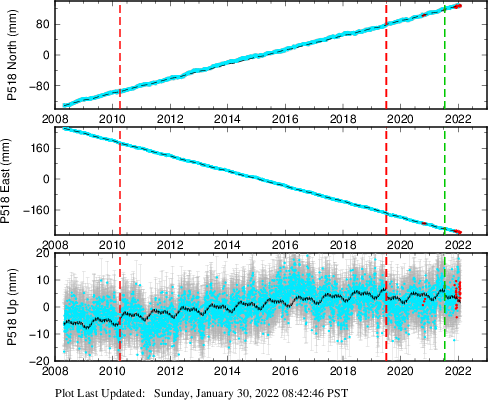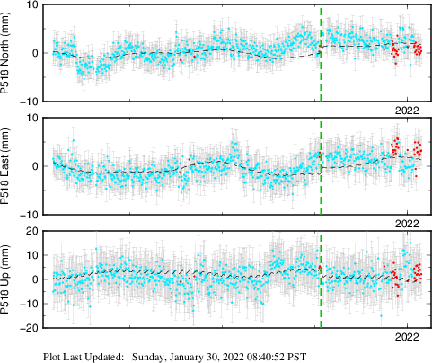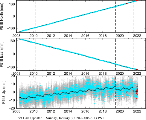 These results are preliminary. The station positions are unchecked and should not be used for any engineering applications. There may be errors in the antenna heights. The velocities are very dependent on the length of the span of observations. The presence of outliers (errant observations) sometimes contaminates the velocities.