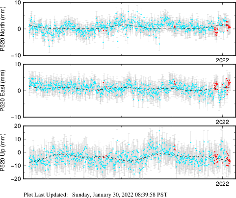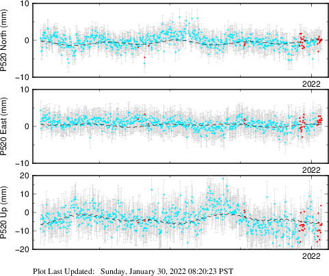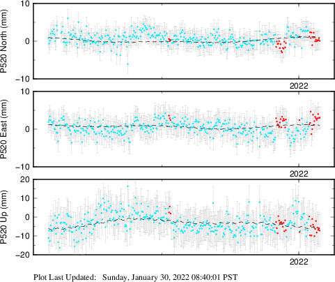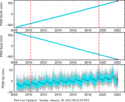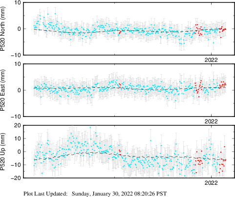 These results are preliminary. The station positions are unchecked and should not be used for any engineering applications. There may be errors in the antenna heights. The velocities are very dependent on the length of the span of observations. The presence of outliers (errant observations) sometimes contaminates the velocities.