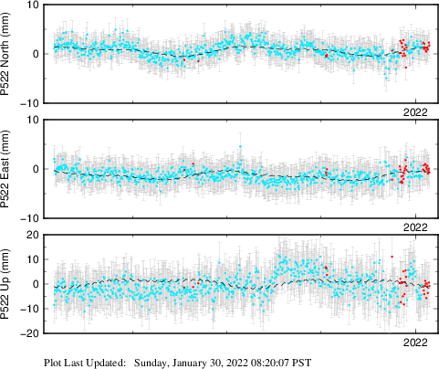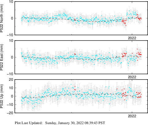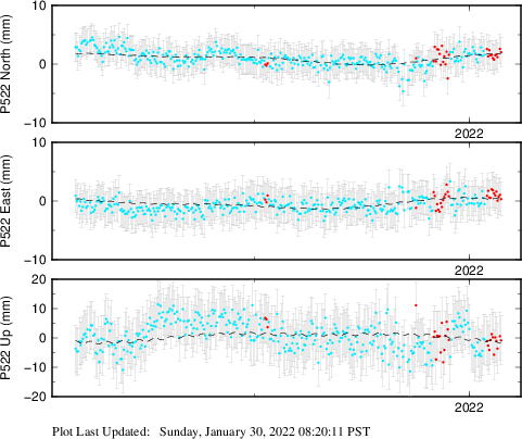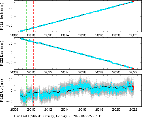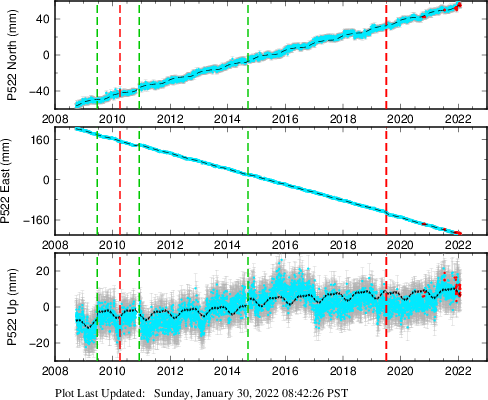 These results are preliminary. The station positions are unchecked and should not be used for any engineering applications. There may be errors in the antenna heights. The velocities are very dependent on the length of the span of observations. The presence of outliers (errant observations) sometimes contaminates the velocities.