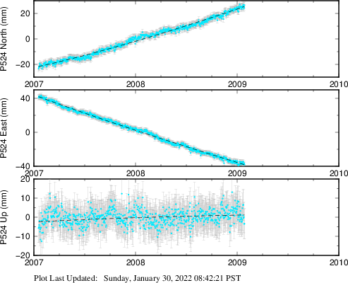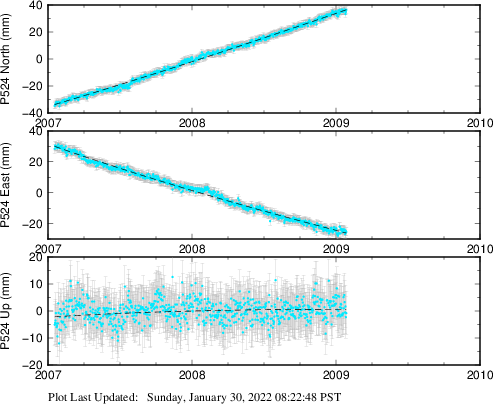 These results are preliminary. The station positions are unchecked and should not be used for any engineering applications. There may be errors in the antenna heights. The velocities are very dependent on the length of the span of observations. The presence of outliers (errant observations) sometimes contaminates the velocities.