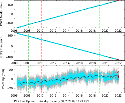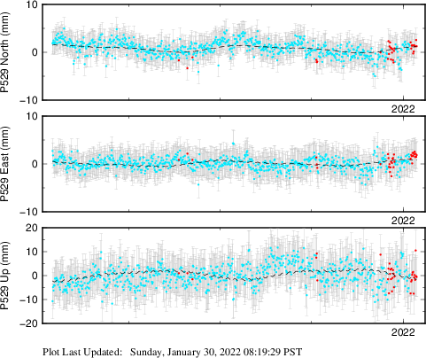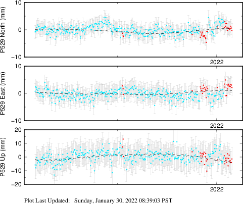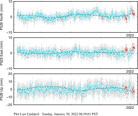 These results are preliminary. The station positions are unchecked and should not be used for any engineering applications. There may be errors in the antenna heights. The velocities are very dependent on the length of the span of observations. The presence of outliers (errant observations) sometimes contaminates the velocities.