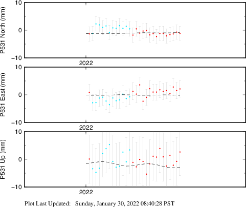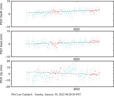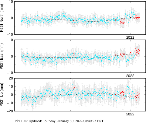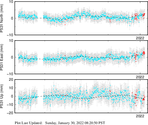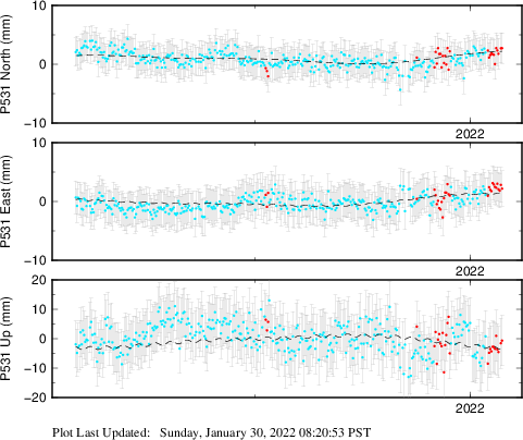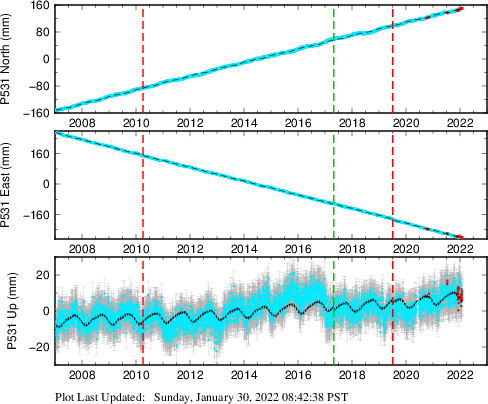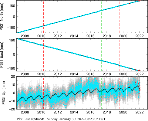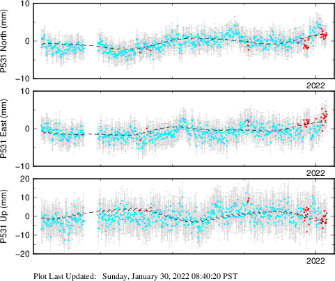These results are preliminary. The station positions are unchecked and should not be used for any engineering applications. There may be errors in the antenna heights. The velocities are very dependent on the length of the span of observations. The presence of outliers (errant observations) sometimes contaminates the velocities.