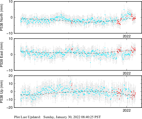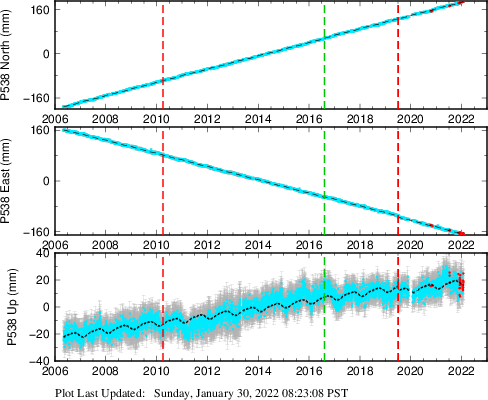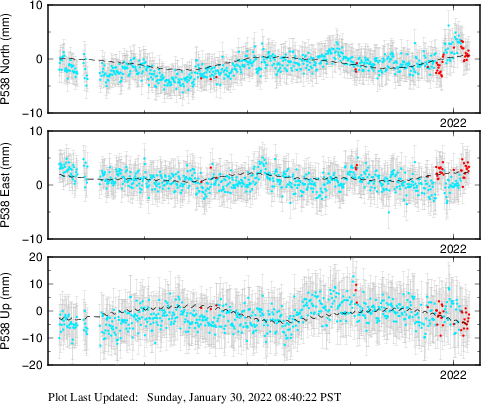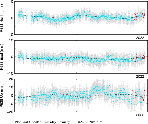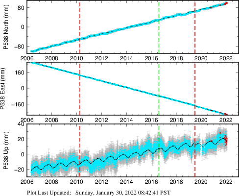 These results are preliminary. The station positions are unchecked and should not be used for any engineering applications. There may be errors in the antenna heights. The velocities are very dependent on the length of the span of observations. The presence of outliers (errant observations) sometimes contaminates the velocities.