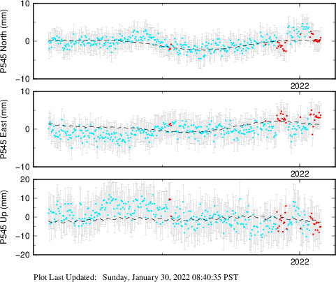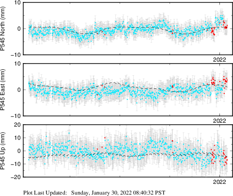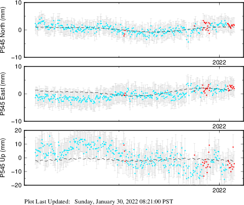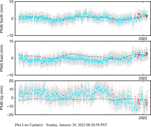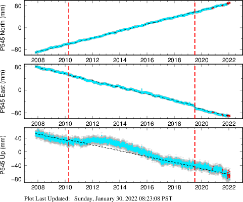 These results are preliminary. The station positions are unchecked and should not be used for any engineering applications. There may be errors in the antenna heights. The velocities are very dependent on the length of the span of observations. The presence of outliers (errant observations) sometimes contaminates the velocities.
