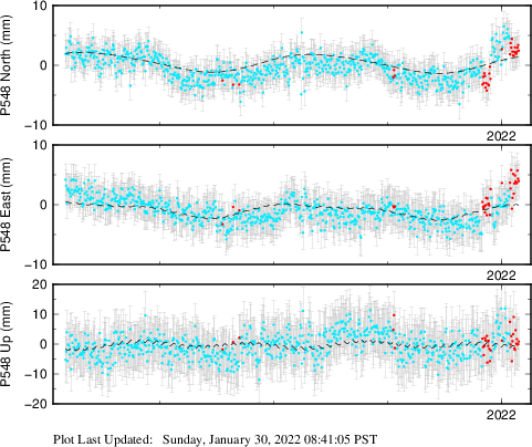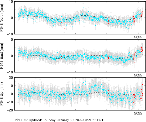 | Decimal date | N log amplitude (mm) | N log amplitude standard deviation (mm) | N time constant (years) | E log amplitude (mm) | E log amplitude standard deviation (mm) | E time constant (years) | U log amplitude (mm) | U log amplitude standard deviation (mm) | U time constant (years) | |