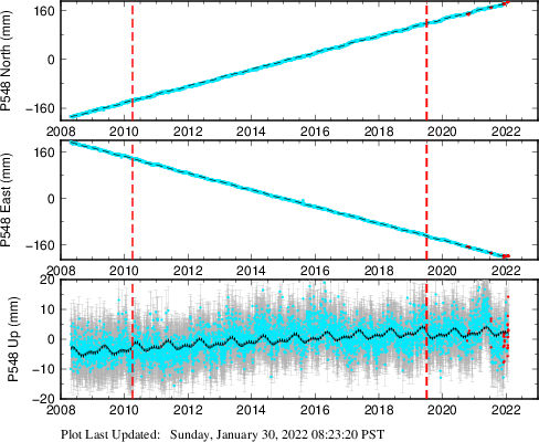 These results are preliminary. The station positions are unchecked and should not be used for any engineering applications. There may be errors in the antenna heights. The velocities are very dependent on the length of the span of observations. The presence of outliers (errant observations) sometimes contaminates the velocities.