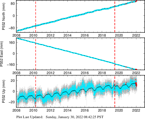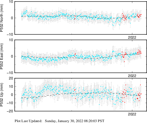 These results are preliminary. The station positions are unchecked and should not be used for any engineering applications. There may be errors in the antenna heights. The velocities are very dependent on the length of the span of observations. The presence of outliers (errant observations) sometimes contaminates the velocities.