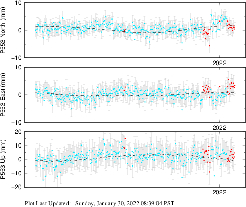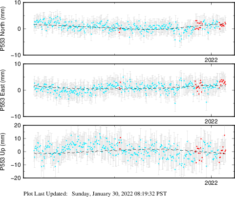 These results are preliminary. The station positions are unchecked and should not be used for any engineering applications. There may be errors in the antenna heights. The velocities are very dependent on the length of the span of observations. The presence of outliers (errant observations) sometimes contaminates the velocities.
